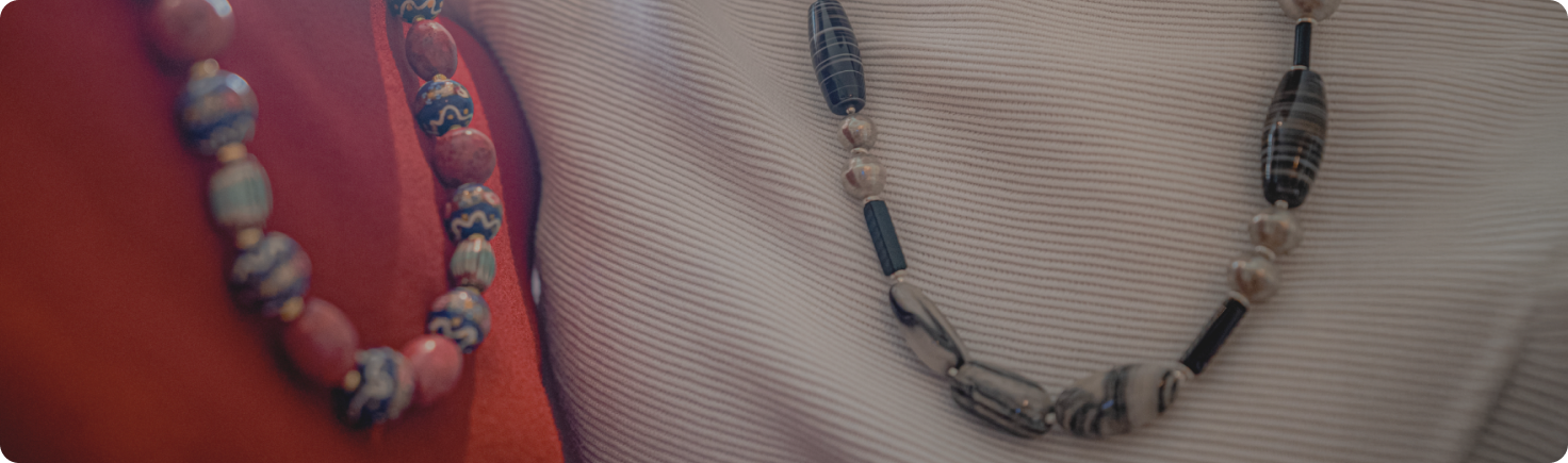 I design and string up all the necklaces on Manik, and they are all one-offs.