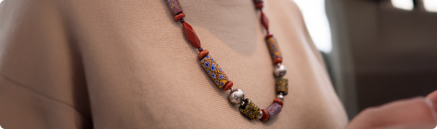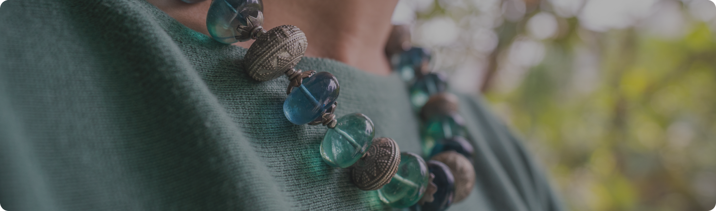 A wide range of beads is used in these necklaces, from semi-precious stone beads to vintage or antique glass beads, to contemporary glass beads, wooden beads, to various metal beads (silver, gold-plated silver, brass).