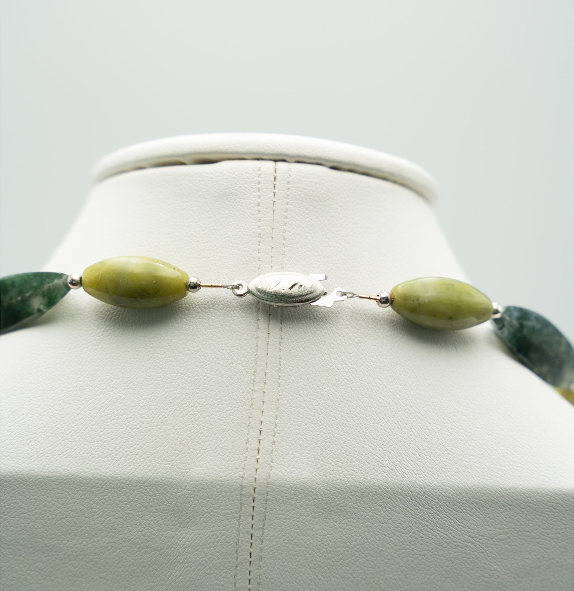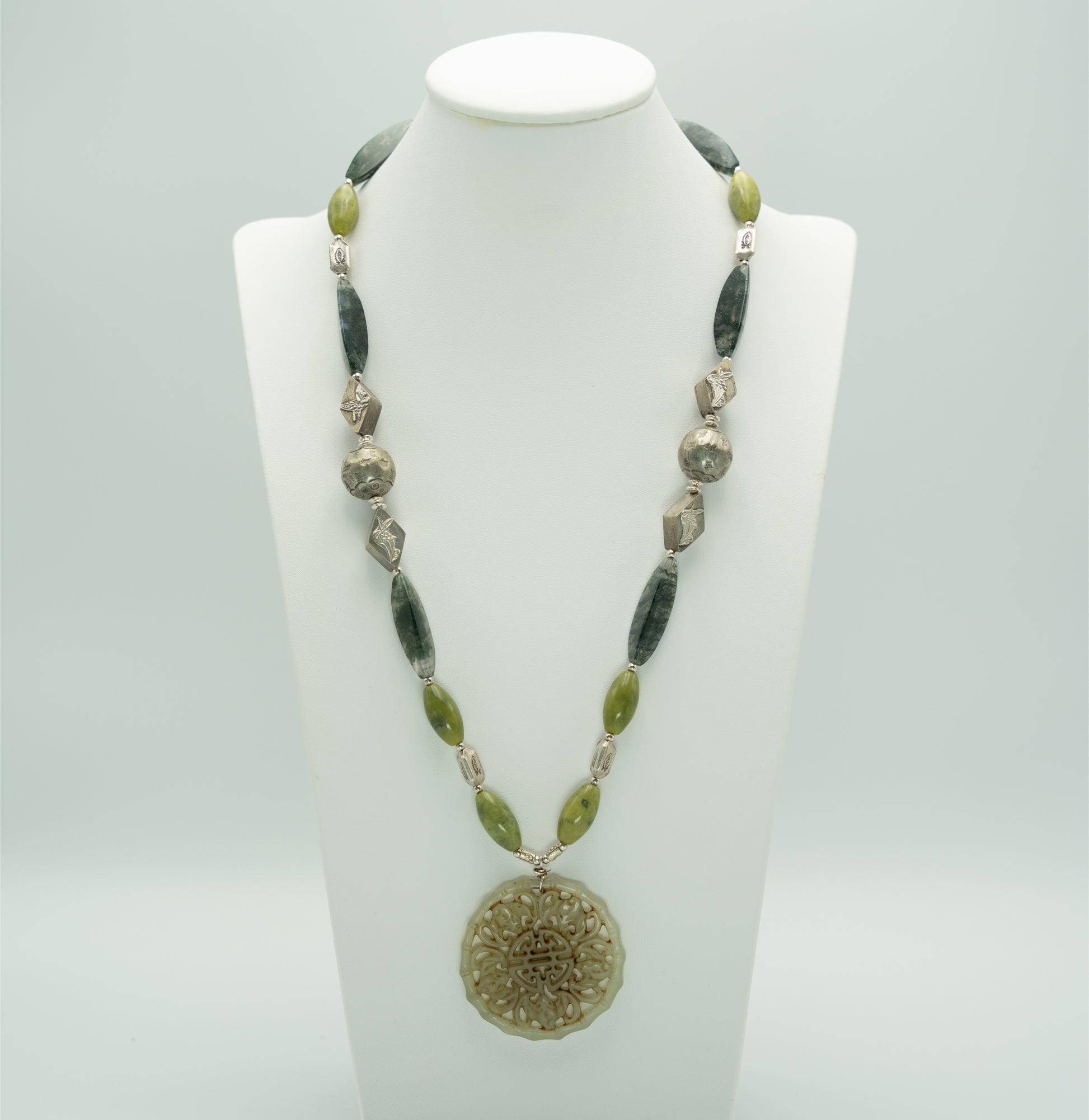 I played around with the design of this necklace for quite some time before I hit on the combination of beads that worked. I had bought a number of these carved “jade” pendants from my bead supplier Mr L years ago, but never got round to using any of them in a necklace. It was now time to do so for Manik!