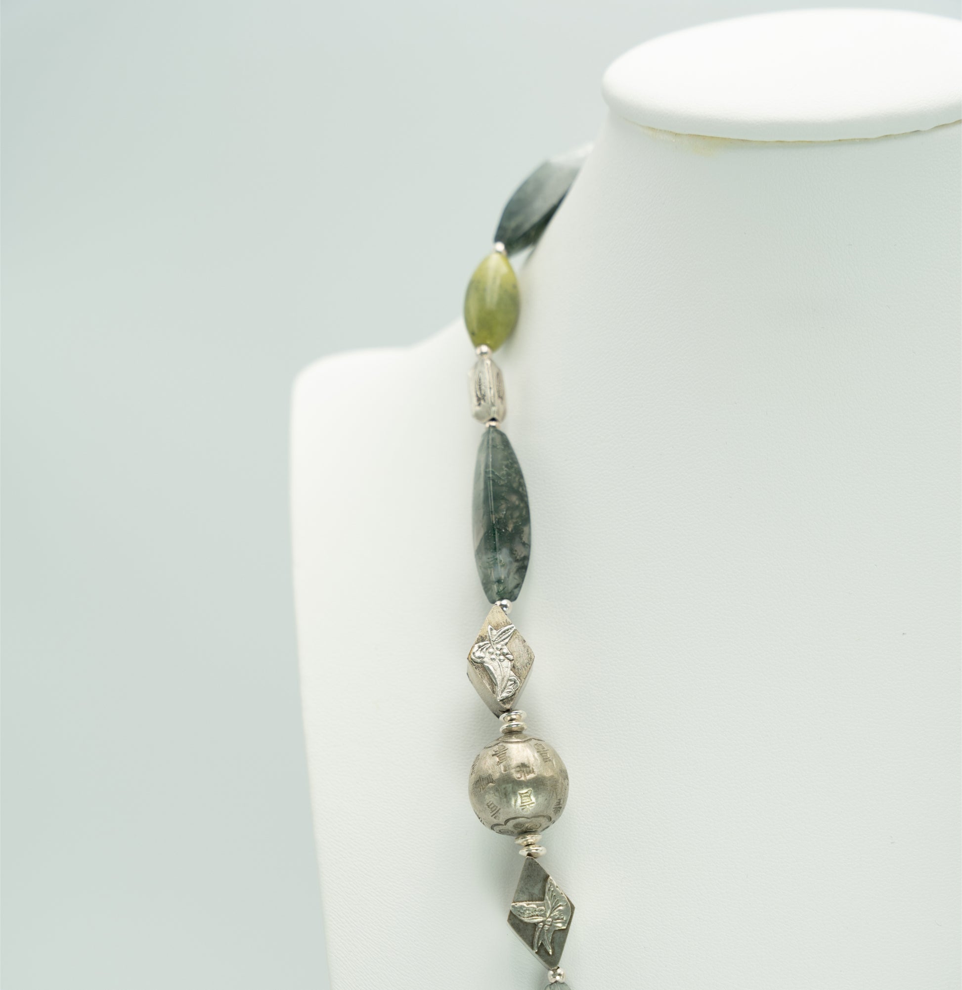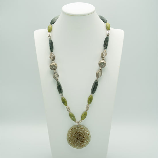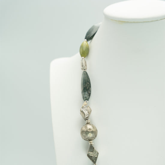 This 62cm long necklace, a symphony in green, has a carved serpentine pendant which drops down by another 49 mm. Other semi-precious stone beads are green jasper and lodolite, with Thai and Chinese silver beads brightening up the necklace. For more info on the necklace, please click on Details, and if interested in my musings, please go to Story.