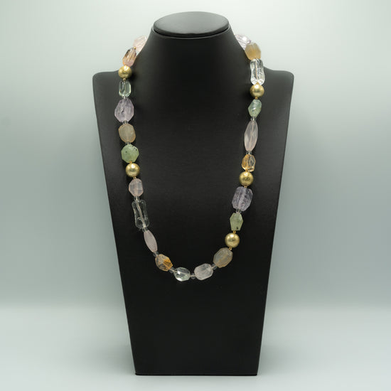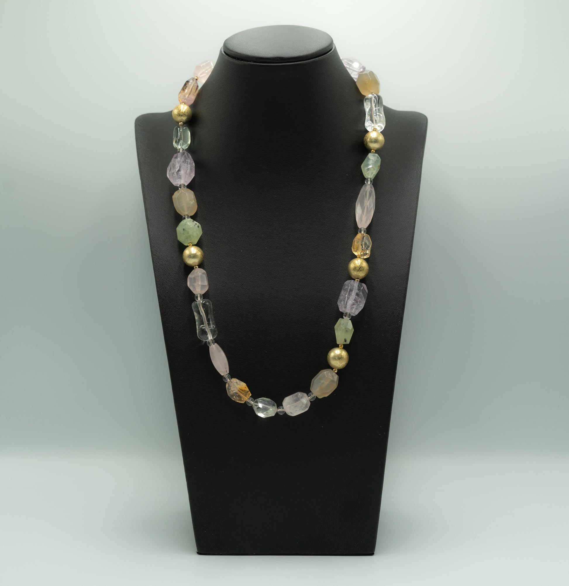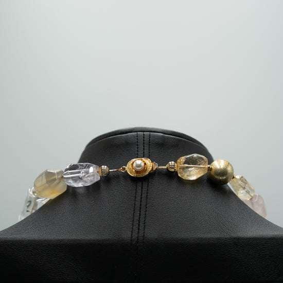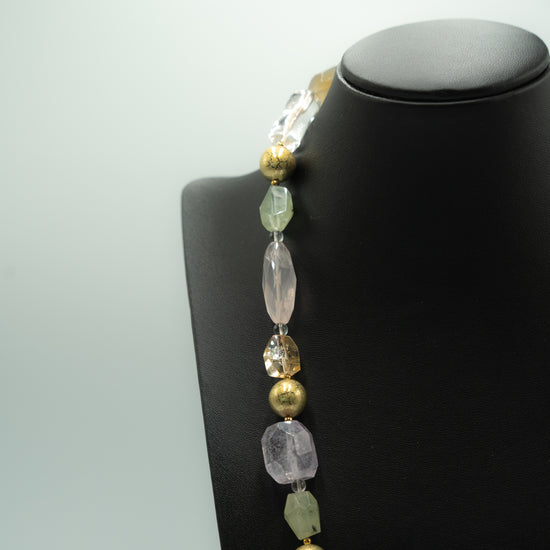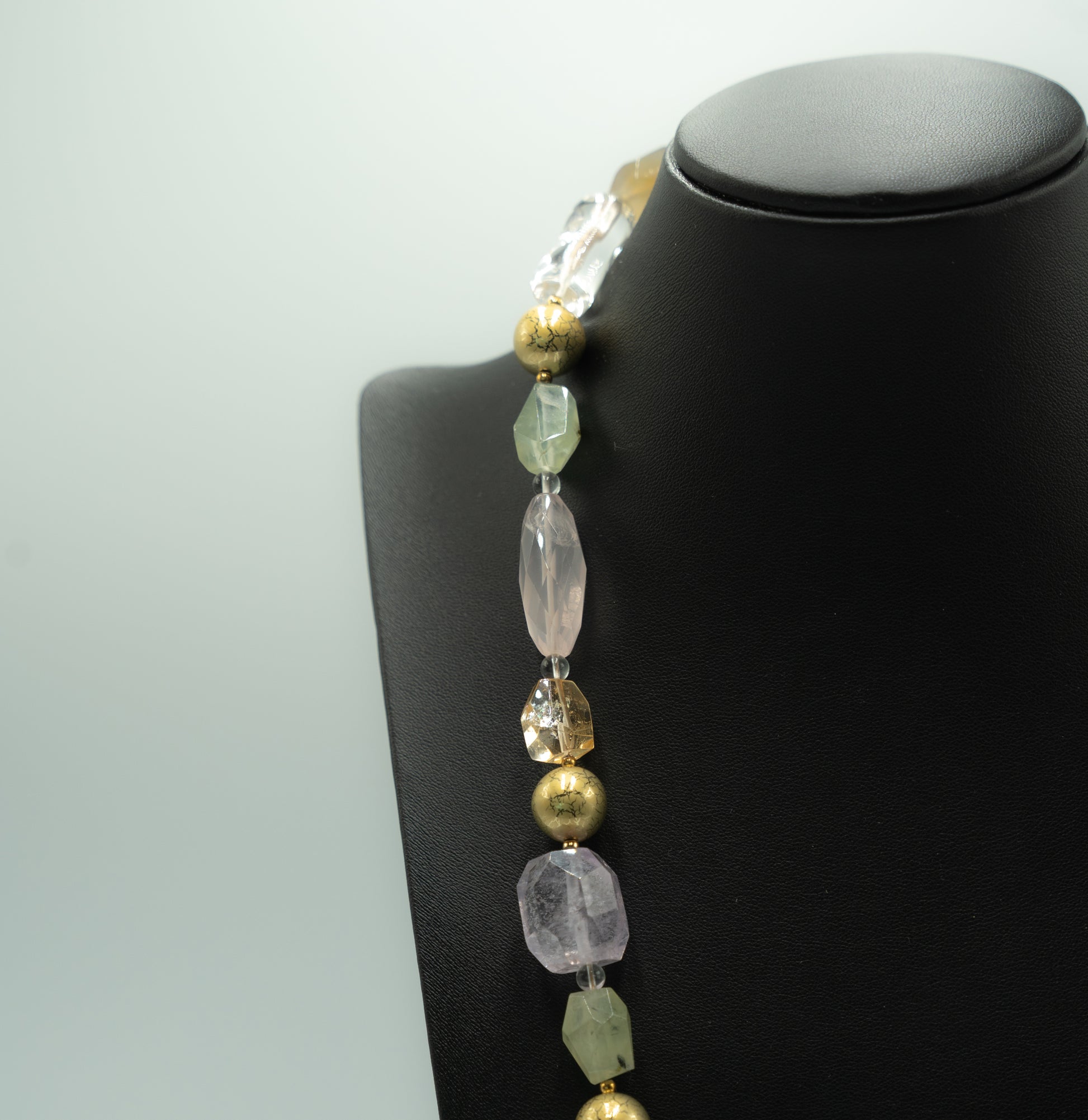 This time when I started working with it for a necklace for Manik, I decide I would pair pink with pink, but the translucent pink of rose quartz. This seemed like a good idea, but the rose quartz barrels that I started off with did not work. Then I visualised rose quartz discs instead, in my mind’s eye and was thrilled to find that I had these smaller irregular shaped pieces of rose quartz in my collection. The iterations then involved finding the right placement of the two types of stones, as well as the right pieces of rose quartz. I was pleased with the final effect of this lively and vibrant necklace, contrasting the stronger pink of the veined rhodonite with the paler pink of the rose quartz pieces.