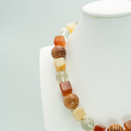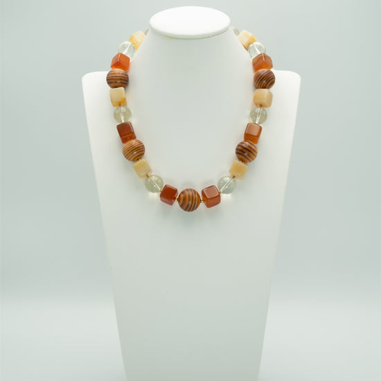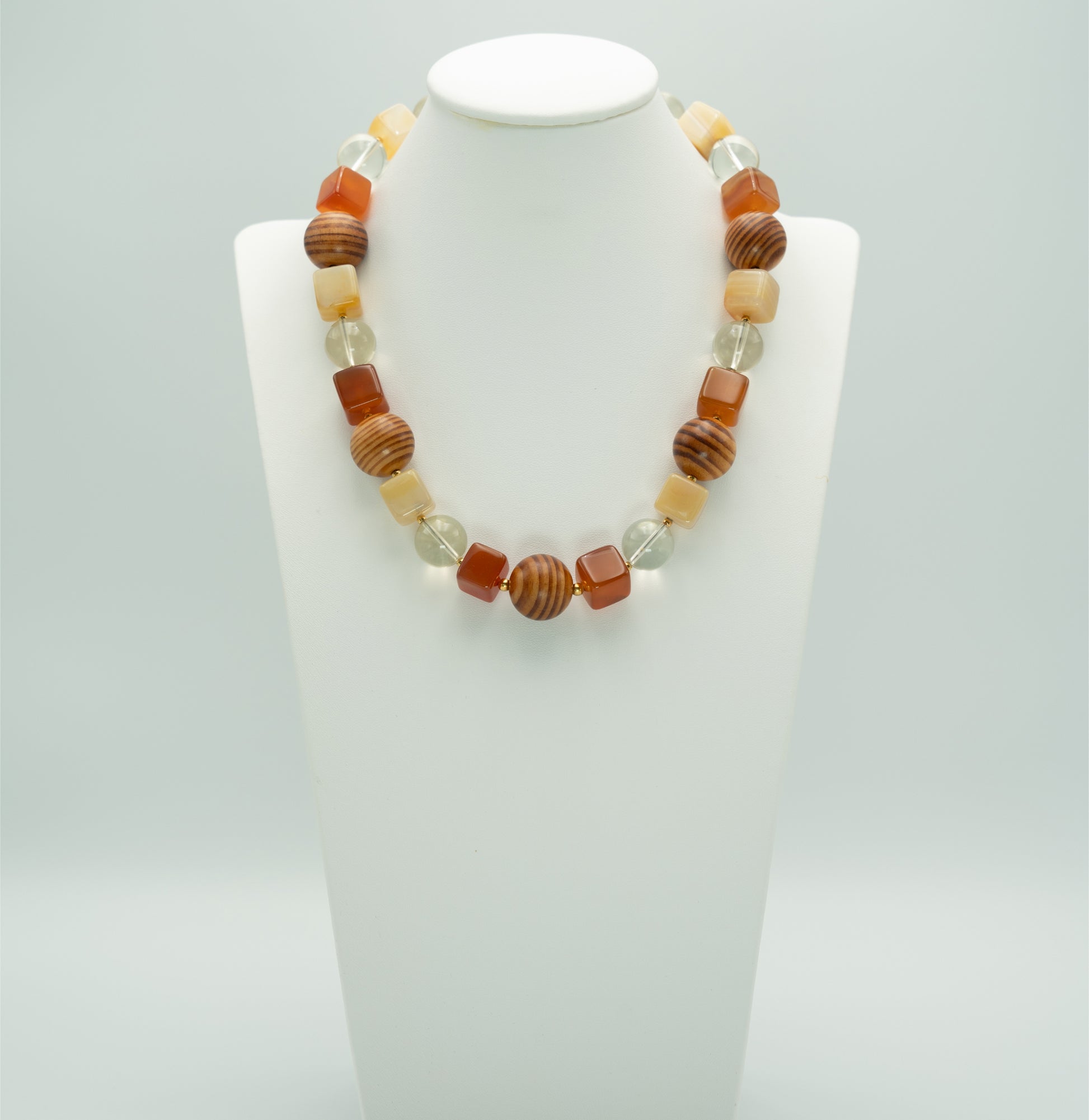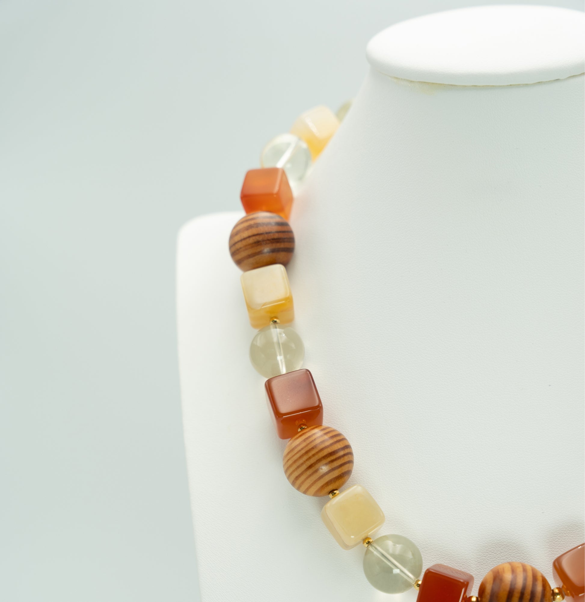 Semi-precious stone beads of agate cubes and lemon quartz are mixed with red dragon wood beads in this 50 cm necklace that feels summery. For more info on the necklace, please click on Details, and if interested in my musings, please go to Story.