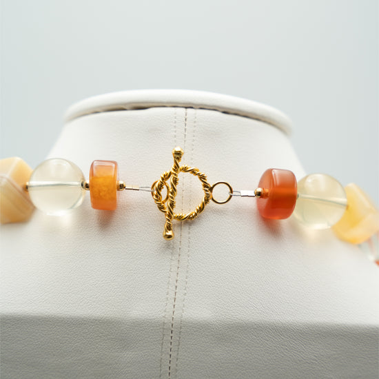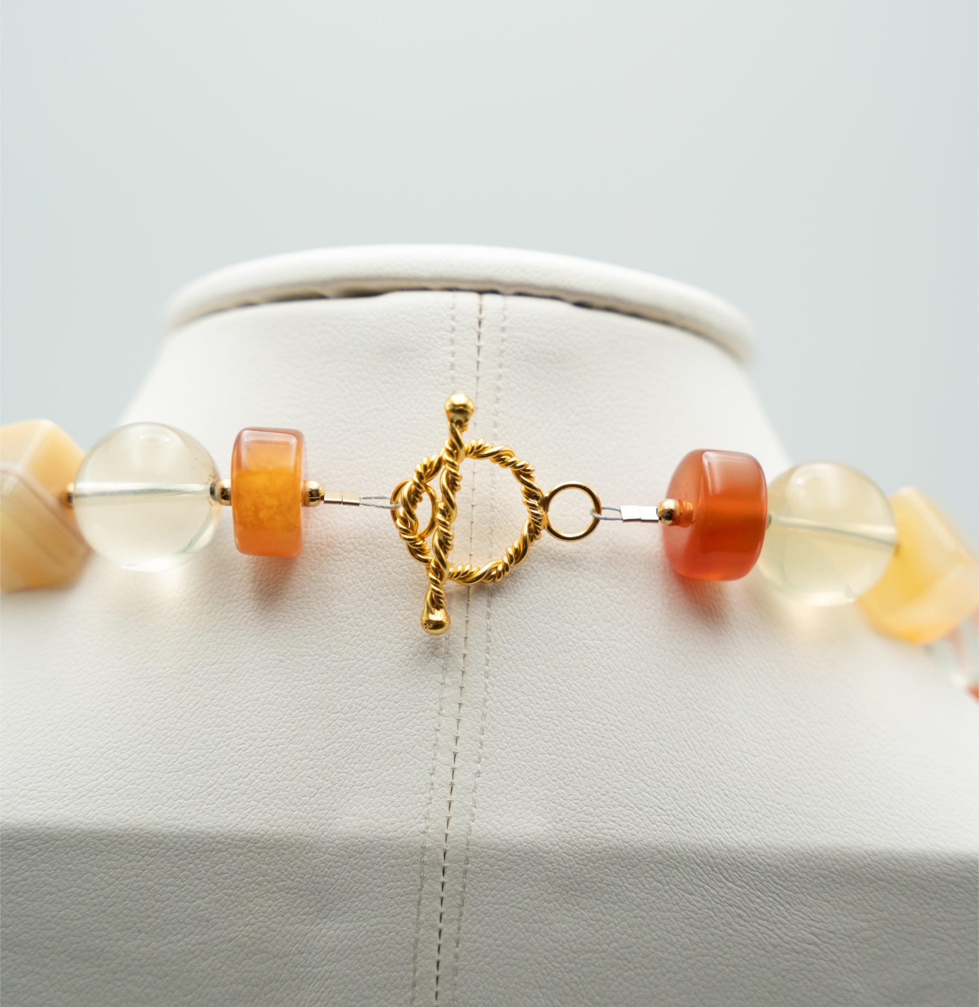 I built a short necklace around the red dragon wood beads. Going for a different shape to contrast with the roundness of the wooden beads, I picked on the agate cubes in orange and creamy yellow. I then needed a bead that would feel ‘light’, and the glass-like transparent lemon quartz in 16 mm fitted the bill. Given the predominance of colours on the yellow spectrum, I went with gold-plated silver spacers. The overall feel of the necklace is summery and vivacious.