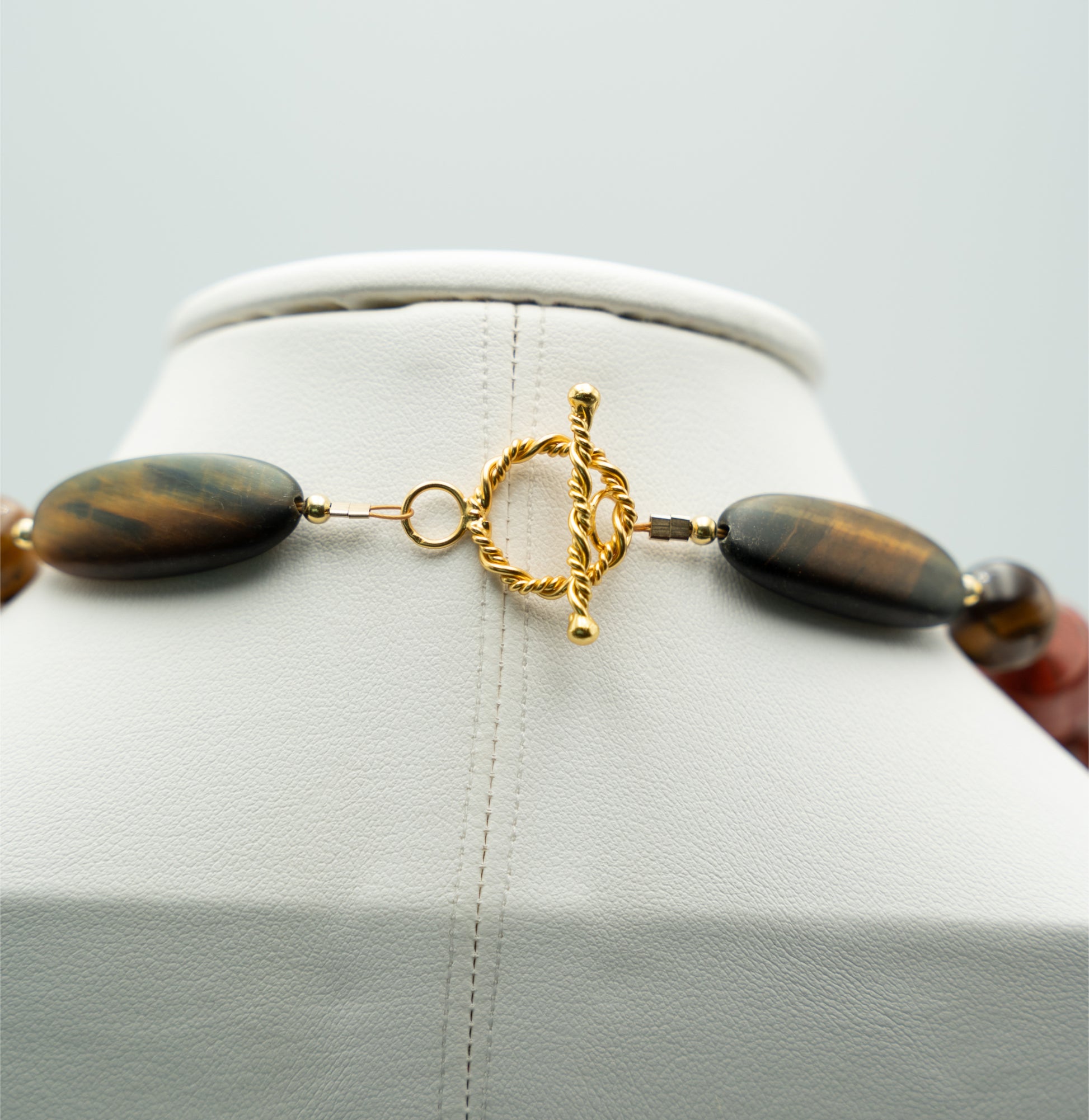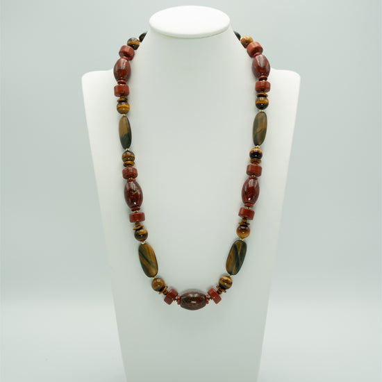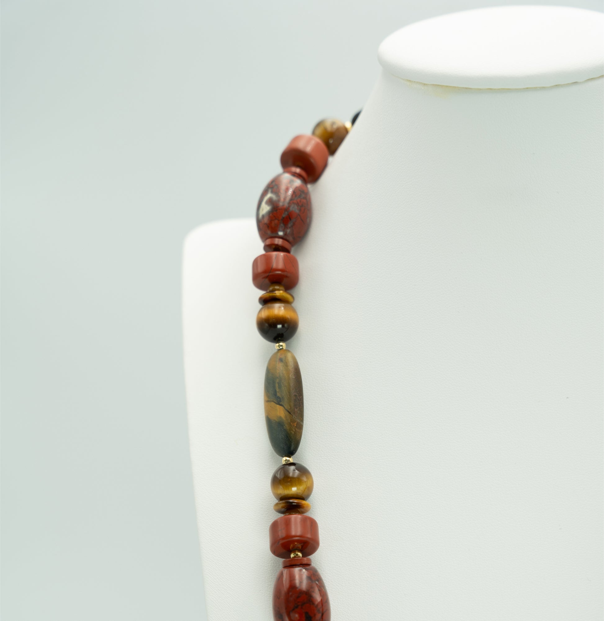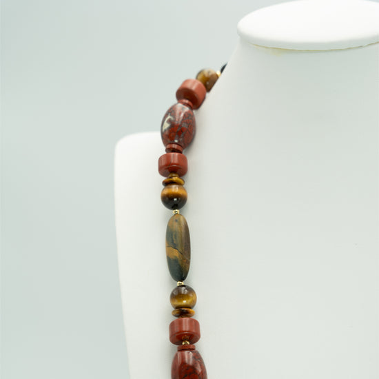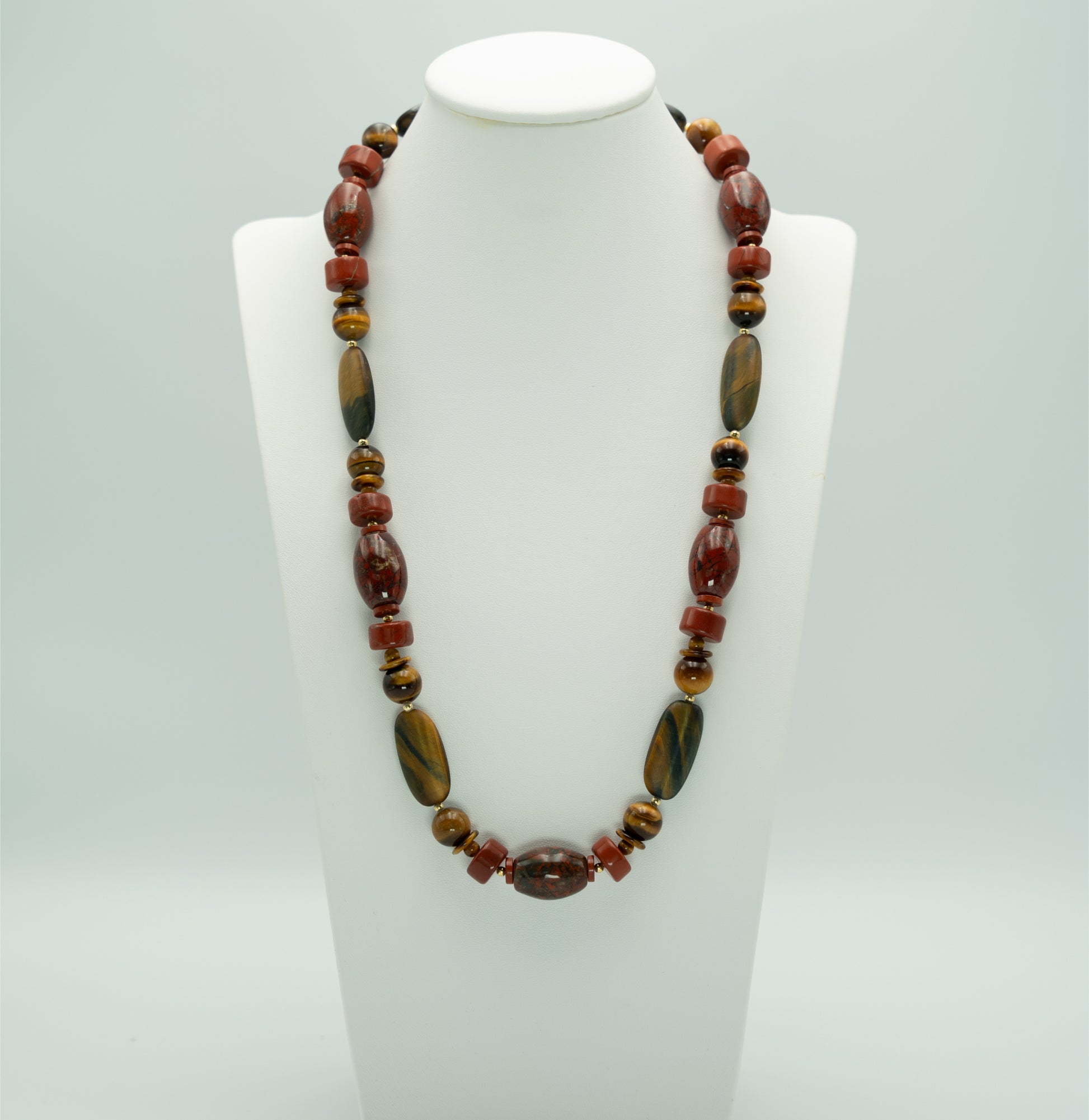 I kept the beautifully patterned brecciated jasper (essentially a form of red jasper but with fragments of stones welded together) but decided to switch out the big octagonal shield-like tiger’s eye tablets. Instead, I found smaller frosted brown tiger’s eye tablets with rounded edges that gave the necklace a softer feel. I also capped the brecciated jasper with thin red jasper discs and retained the thicker red jasper discs. I brought in round brown tiger’s eye beads too. And thus the necklace grew.