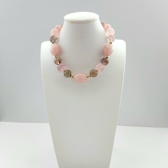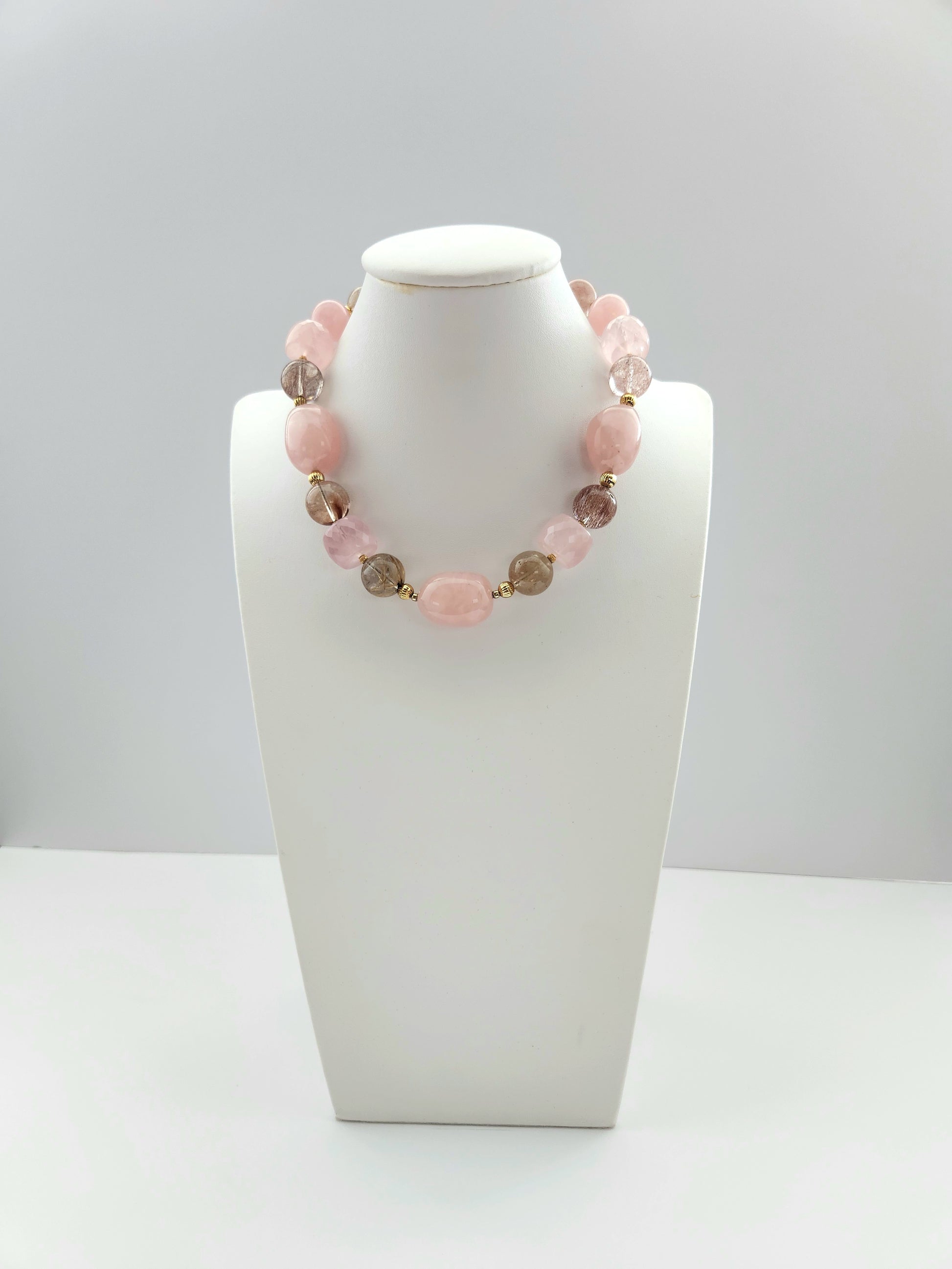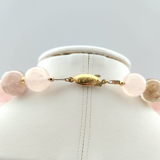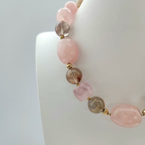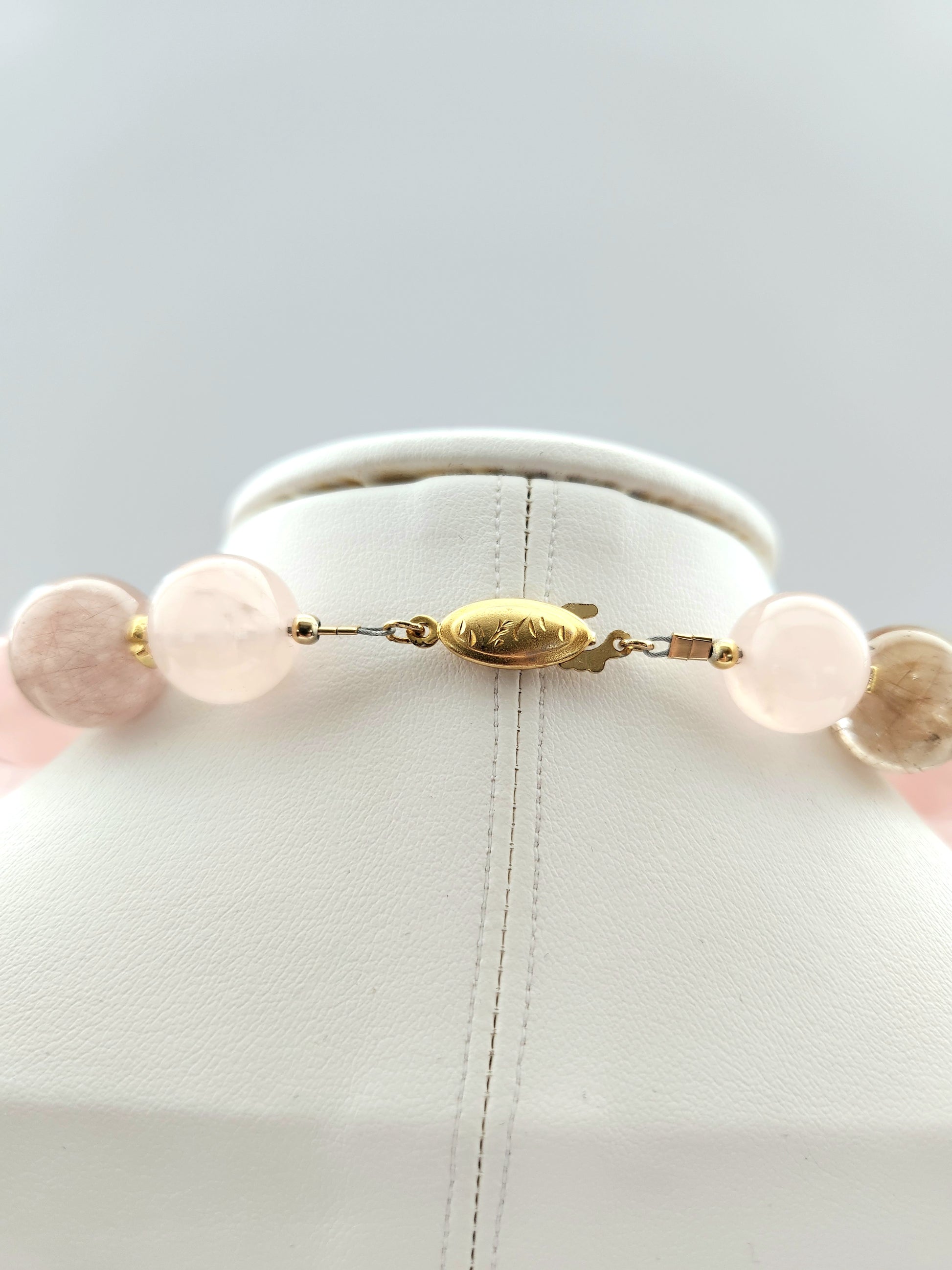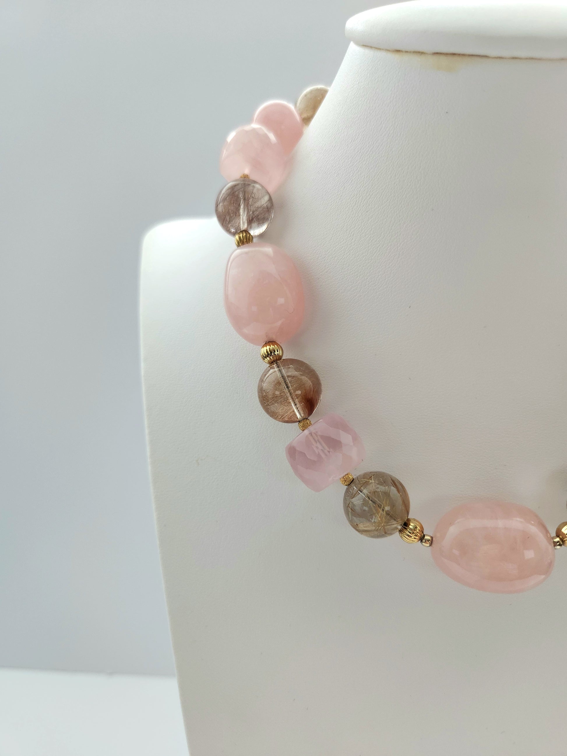 The lovely rose quartz nuggets and the thick faceted discs are the last ones in my collection, and I wanted to give them a good send-off! I set out to design a unique short necklace that would be versatile and would be suitable for both day and evening wear. Leaning towards a design that would convey ‘warmth’ rather than ‘coolness’, I brought out my round golden rutilated quartz gemstone beads; they look like golden rays caught in small globes!