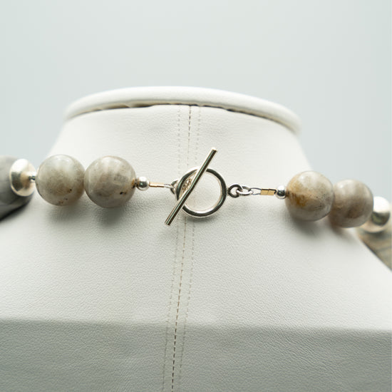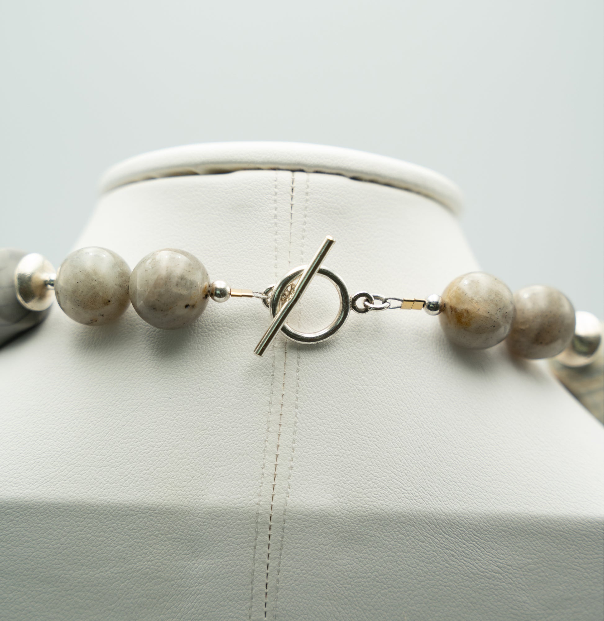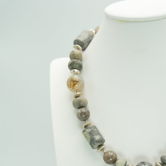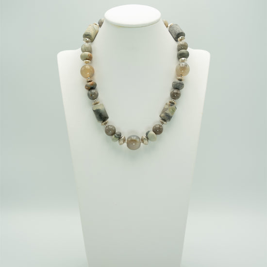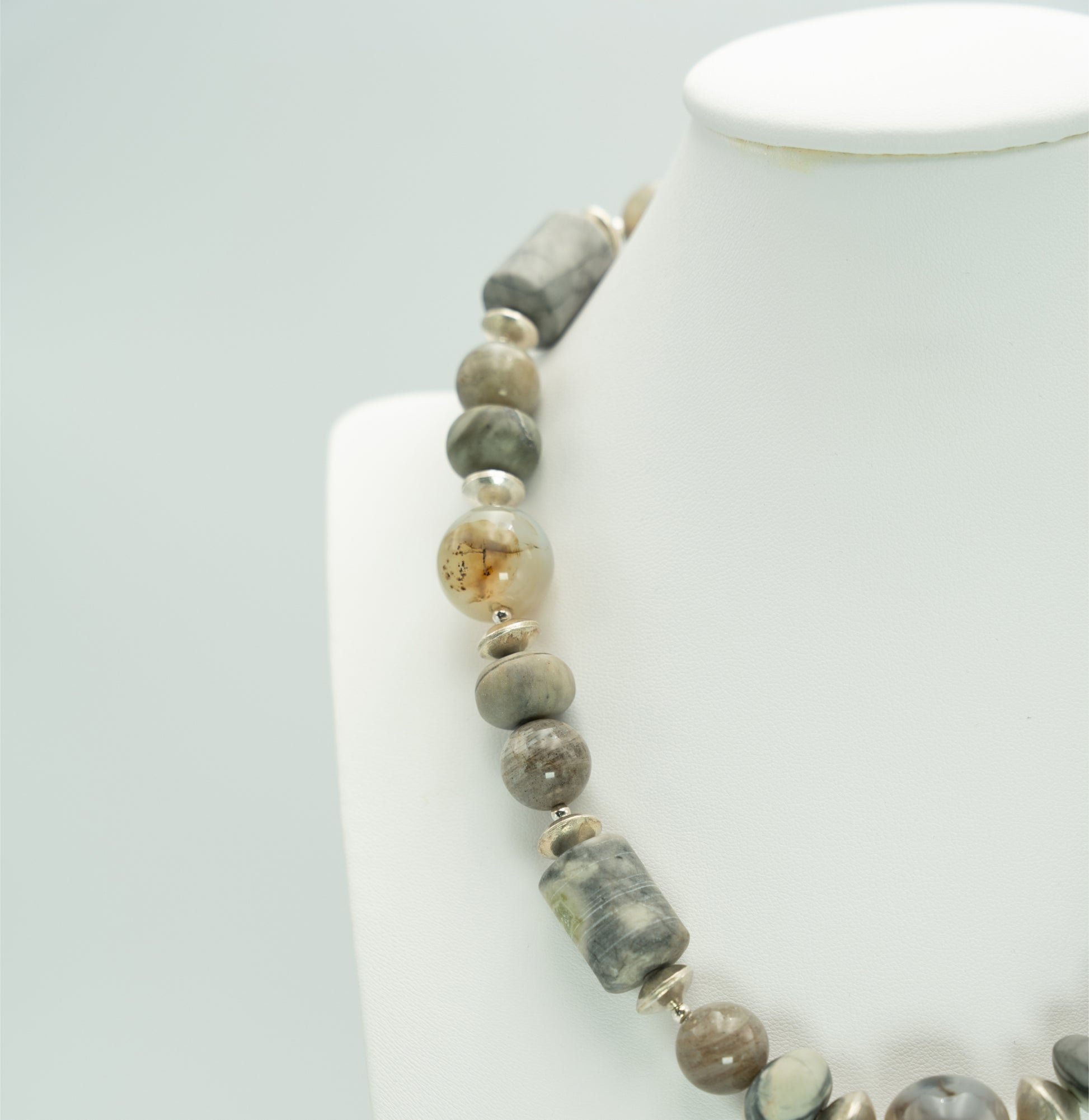 This is a dreamily muted 50 cm long necklace in shades of grey and beige, featuring semi-precious stone beads in Picasso jasper, agate, labradorite, and bright silver beads. For more info on the necklace, please click on Details, and if interested in my musings, please go to Story.
