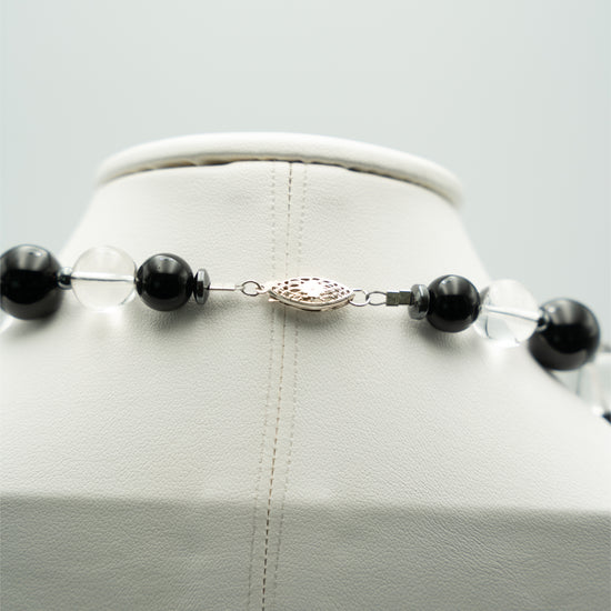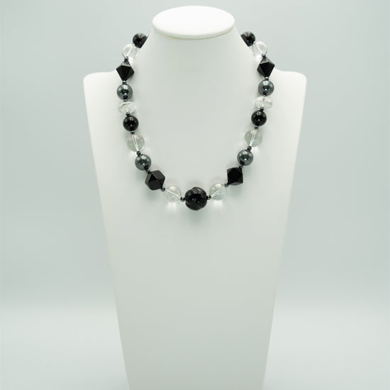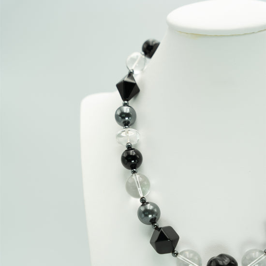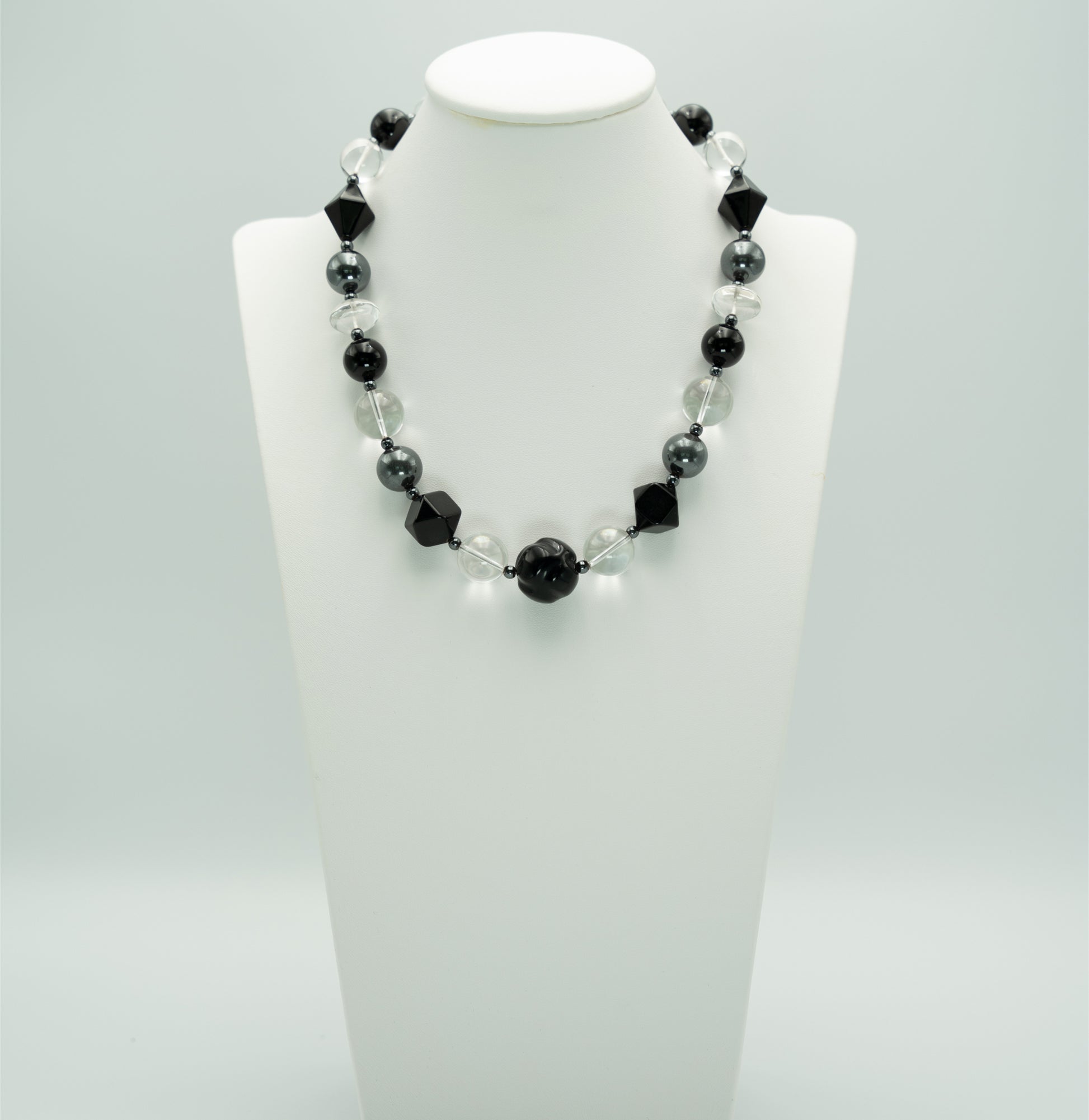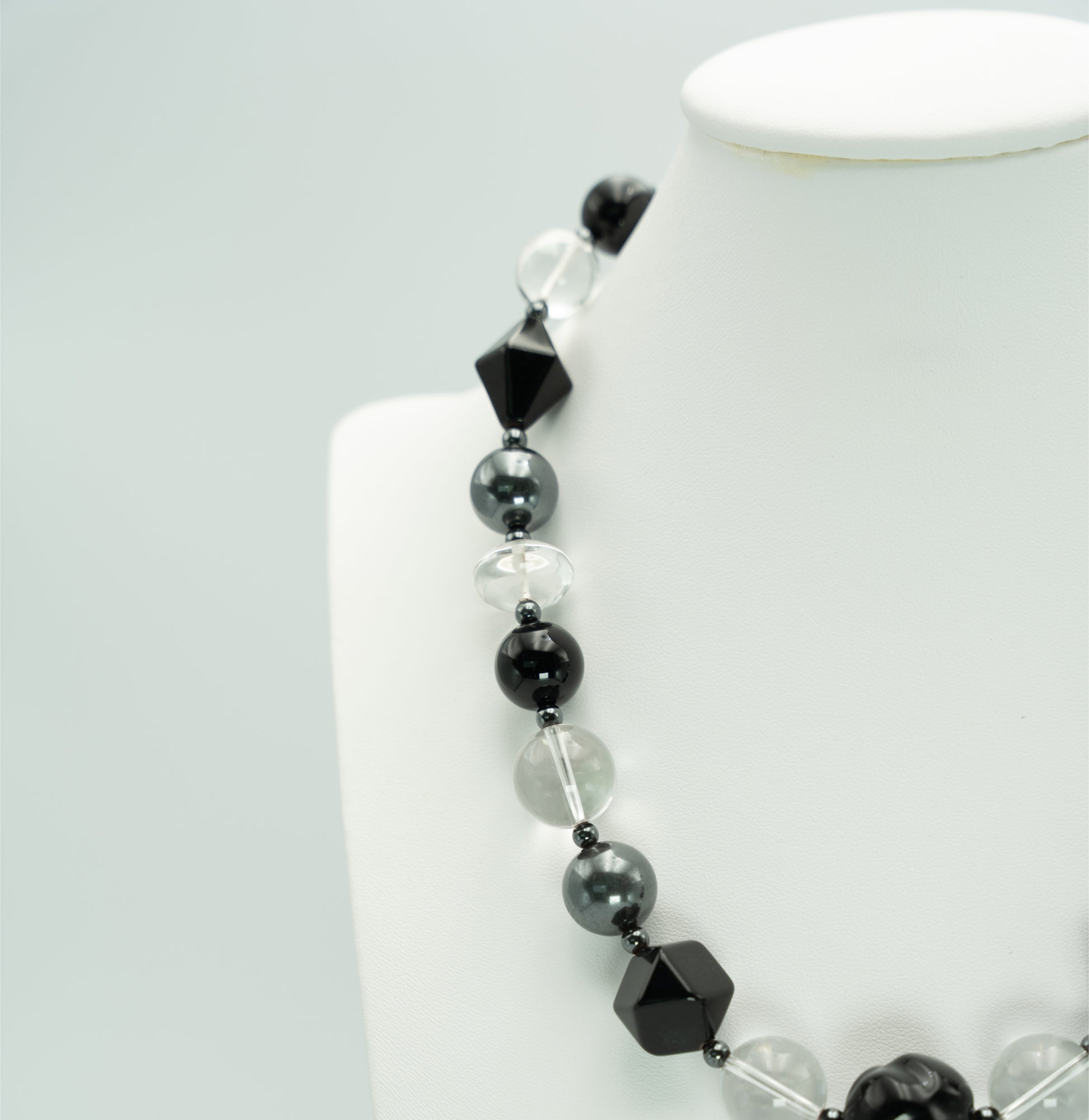 Black onyx, transparent rock crystal and silver grey haematite in various shapes come together in this short 48cm necklace that projects cool and calm. For more info on the necklace, please click on Details, and if interested in my musings, please go to Story.