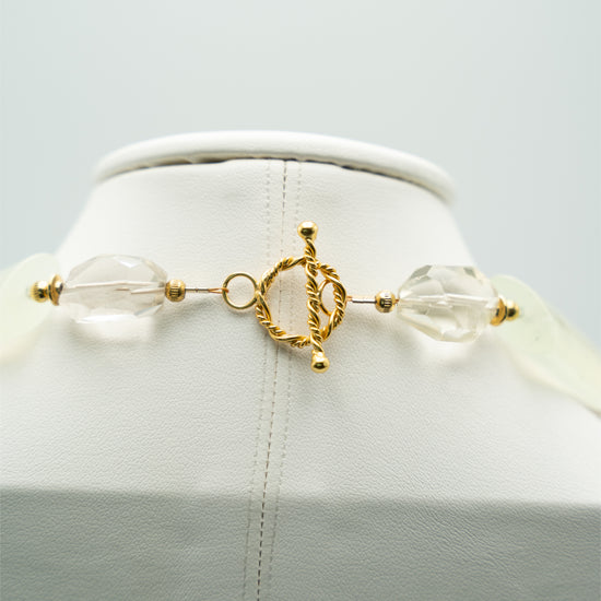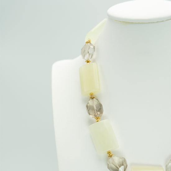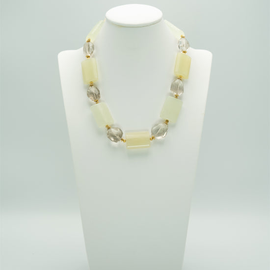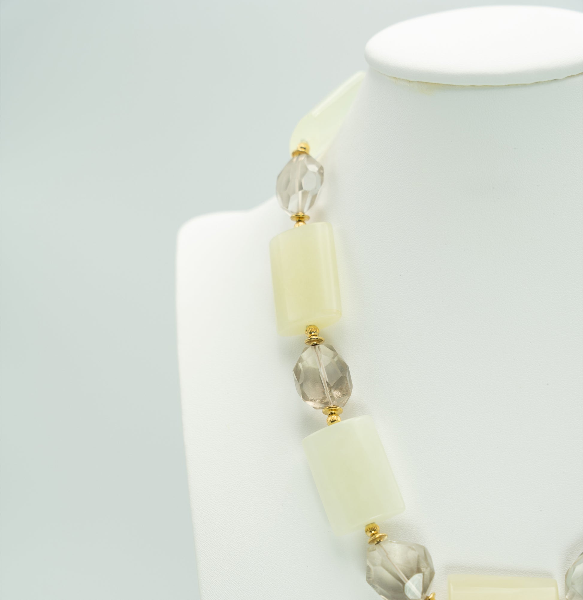 I decided to keep it very simple, alternating the serpentine tiles with the faceted light citrine nuggets, and adding gold metal spacers from France to brighten up the whole.
