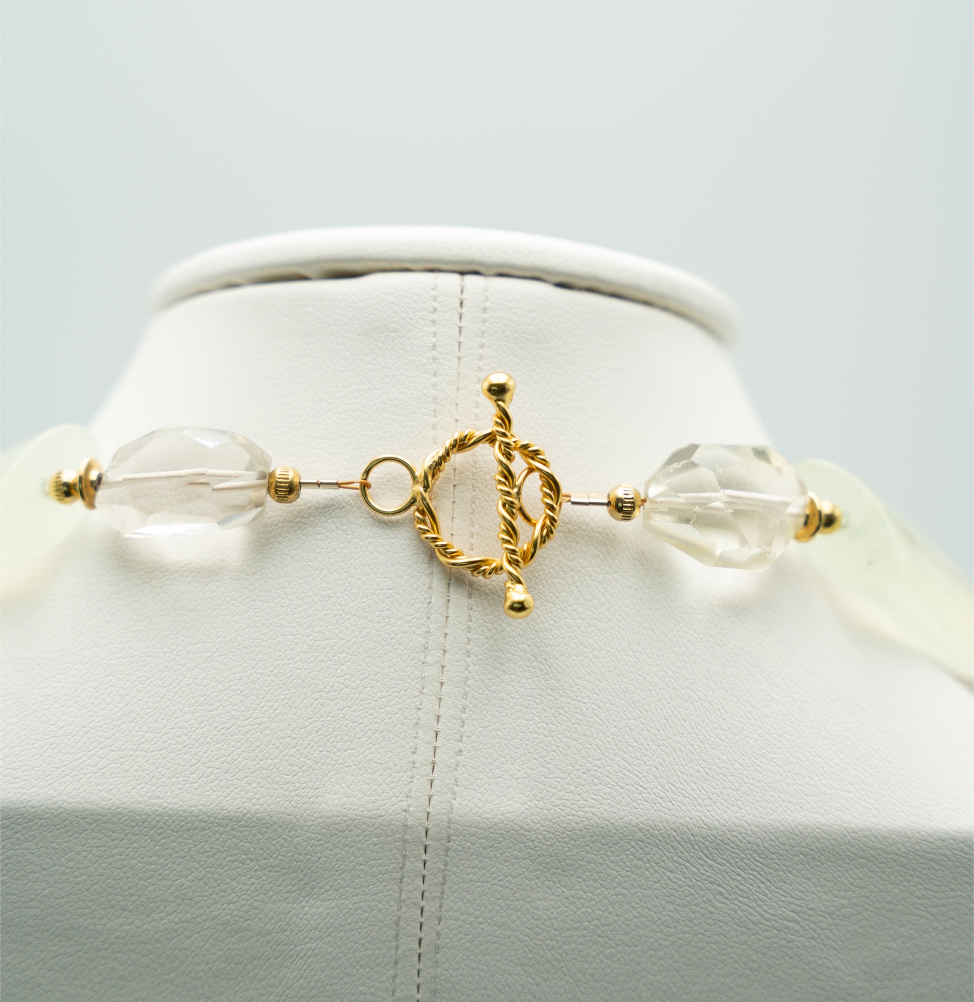 This 50 cm long necklace brings together celadon-coloured serpentine tiles and faceted light citrine in a simple design. For more info on the necklace, please click on Details, and if interested in my musings, please go to Story.