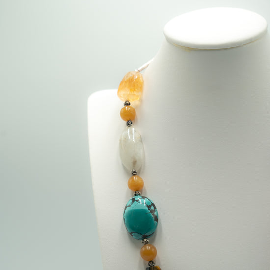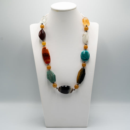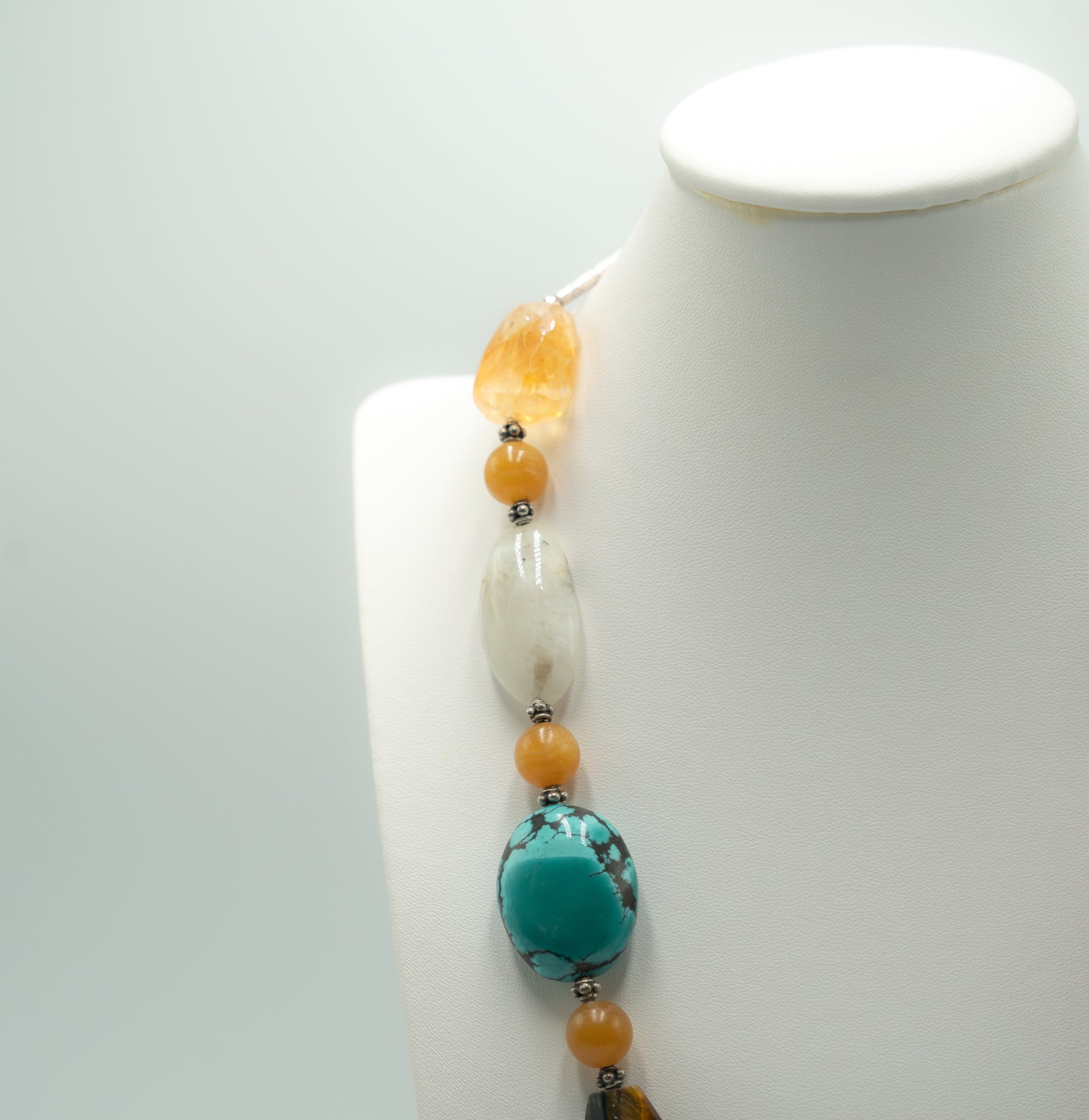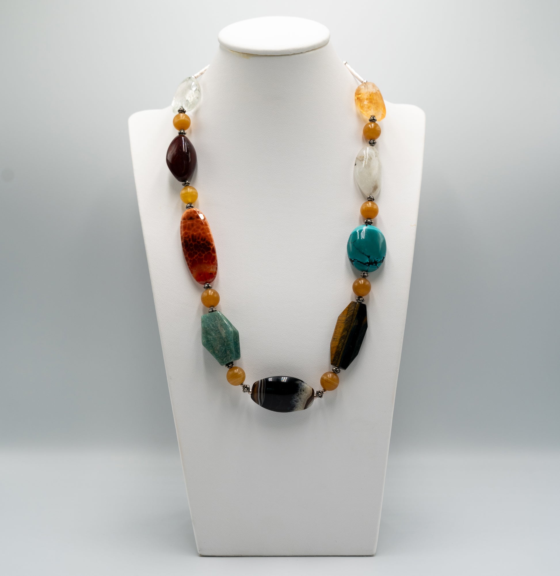 As its name indicates, this 62 cm long striking necklace features ten different kinds of semi-precious stone beads including different agates, tiger’s eye, turquoise, moonstone, citrine, jasper and rock crystal, in different shapes. For more info on the necklace, please click on Details, and if interested in my musings, please go to Story.