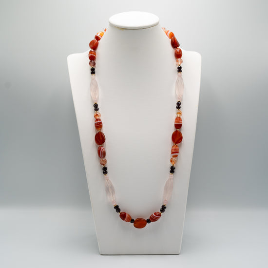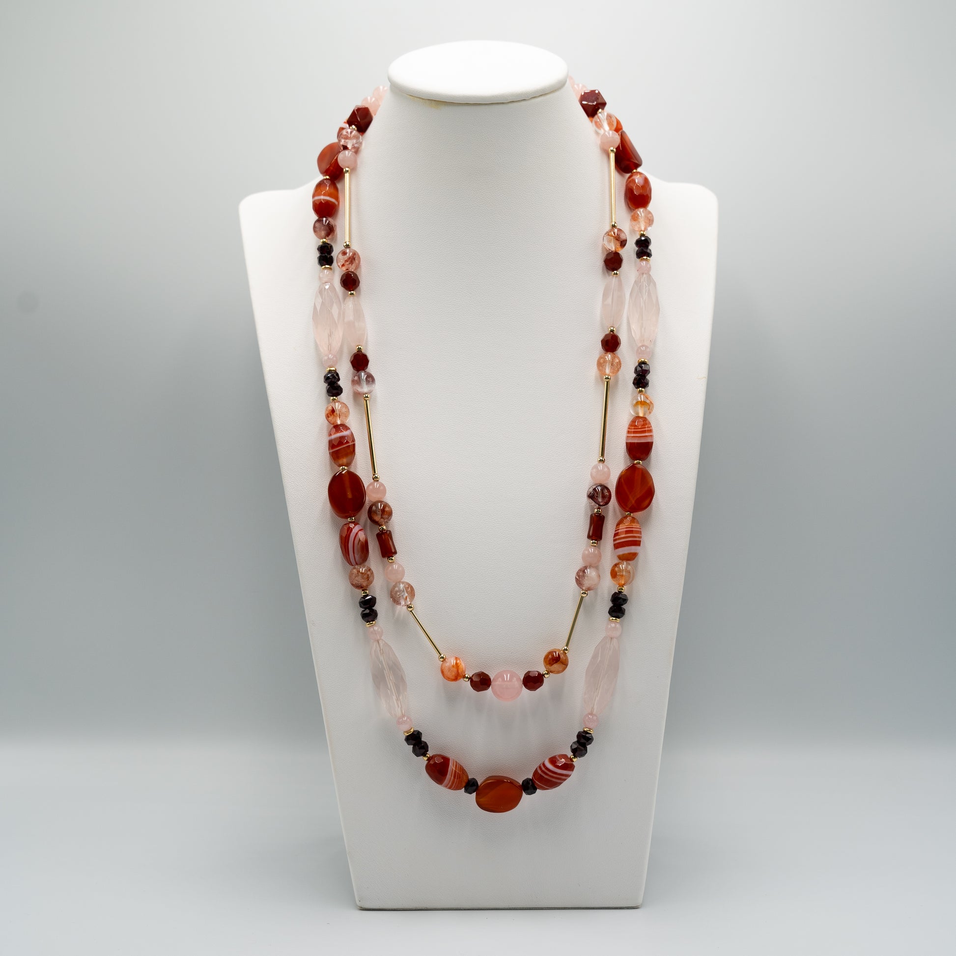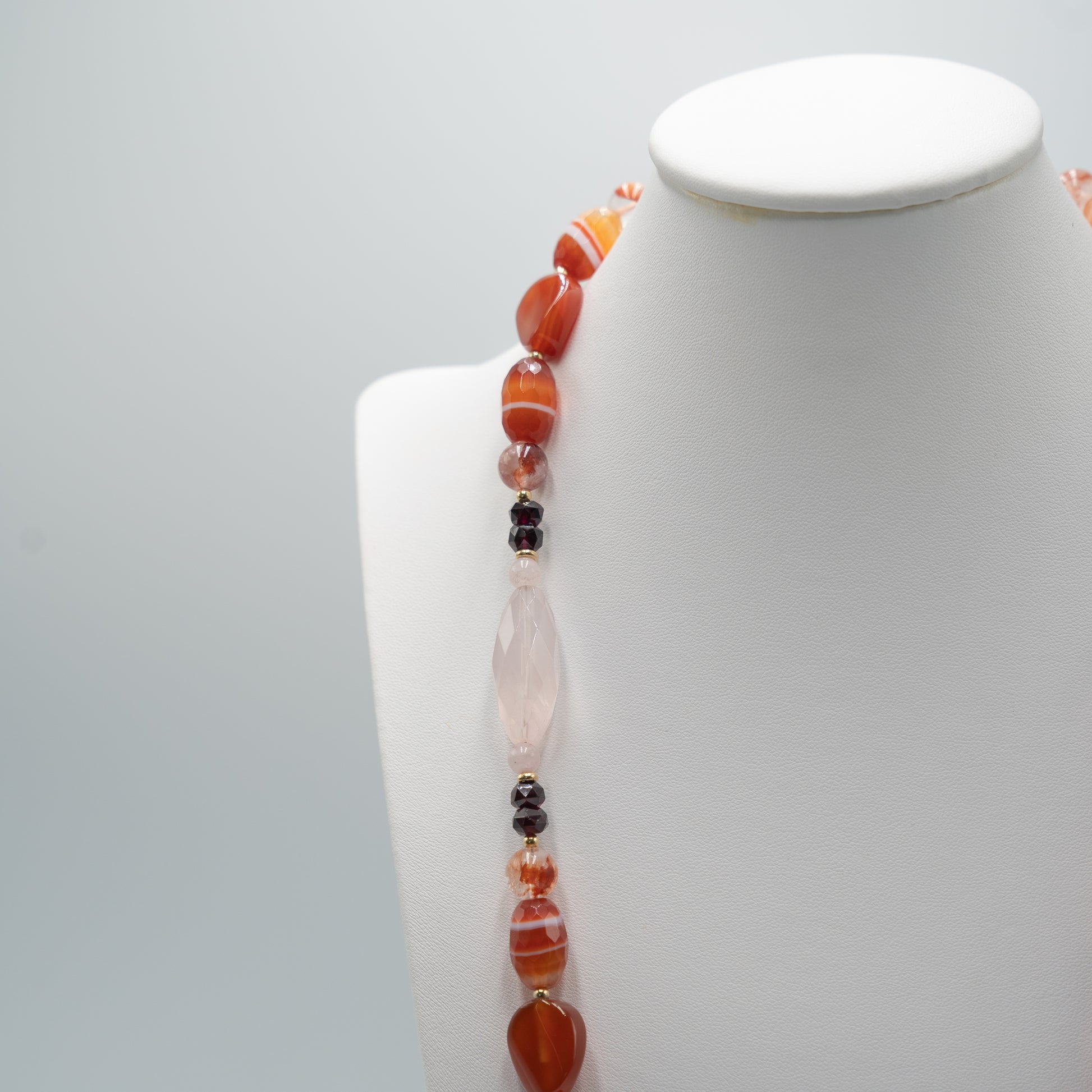 I decided that it would be in the orange/red spectrum, and the beads should not be too large, given that there would be a second necklace. I had been wanting to use the smallish, banded orange agate lozenge, and to this I added the plain tabular agate ones. I alternated the rich orange clusters with the cooler faceted rose quartz bicones, and the addition of the small deep red faceted garnet discs worked beautifully to add an uplifting glow.