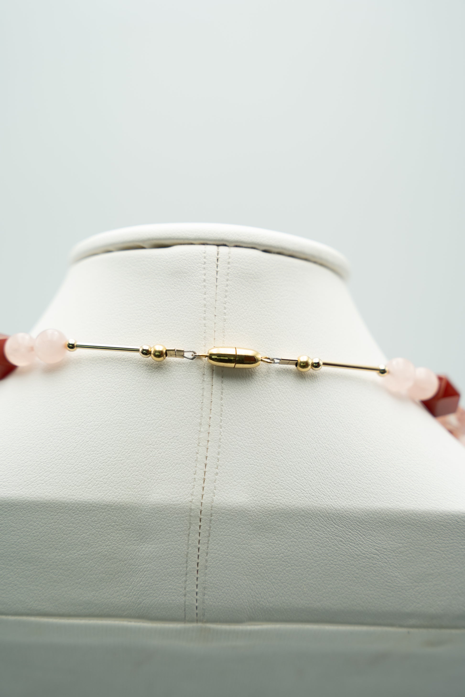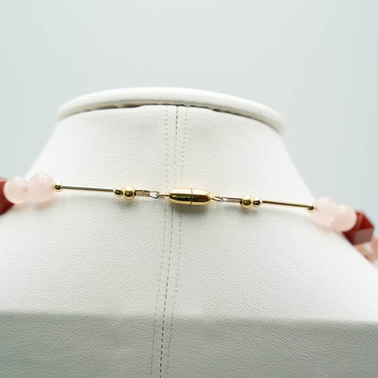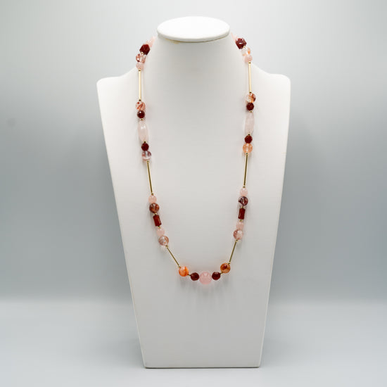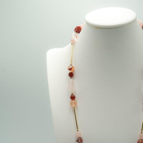 In working on the inner necklace that could be worn either as a companion to “Through Thick”, or on its own, I decided that I would keep to the same gemstone beads, but in smaller sizes. Fortunately, I found smaller rose quartz rounds, faceted red agate in round and spool shape; the cloudy, swirly orange haematoid quartz worked very well too. I wanted this to feel ‘spare’, and so the Japanese gold-coloured metal tubes in different lengths, were just what I needed!