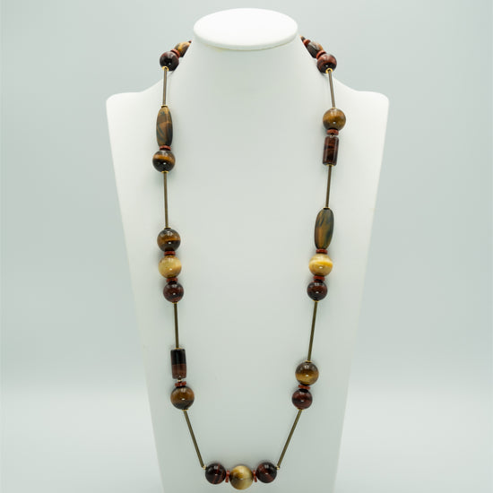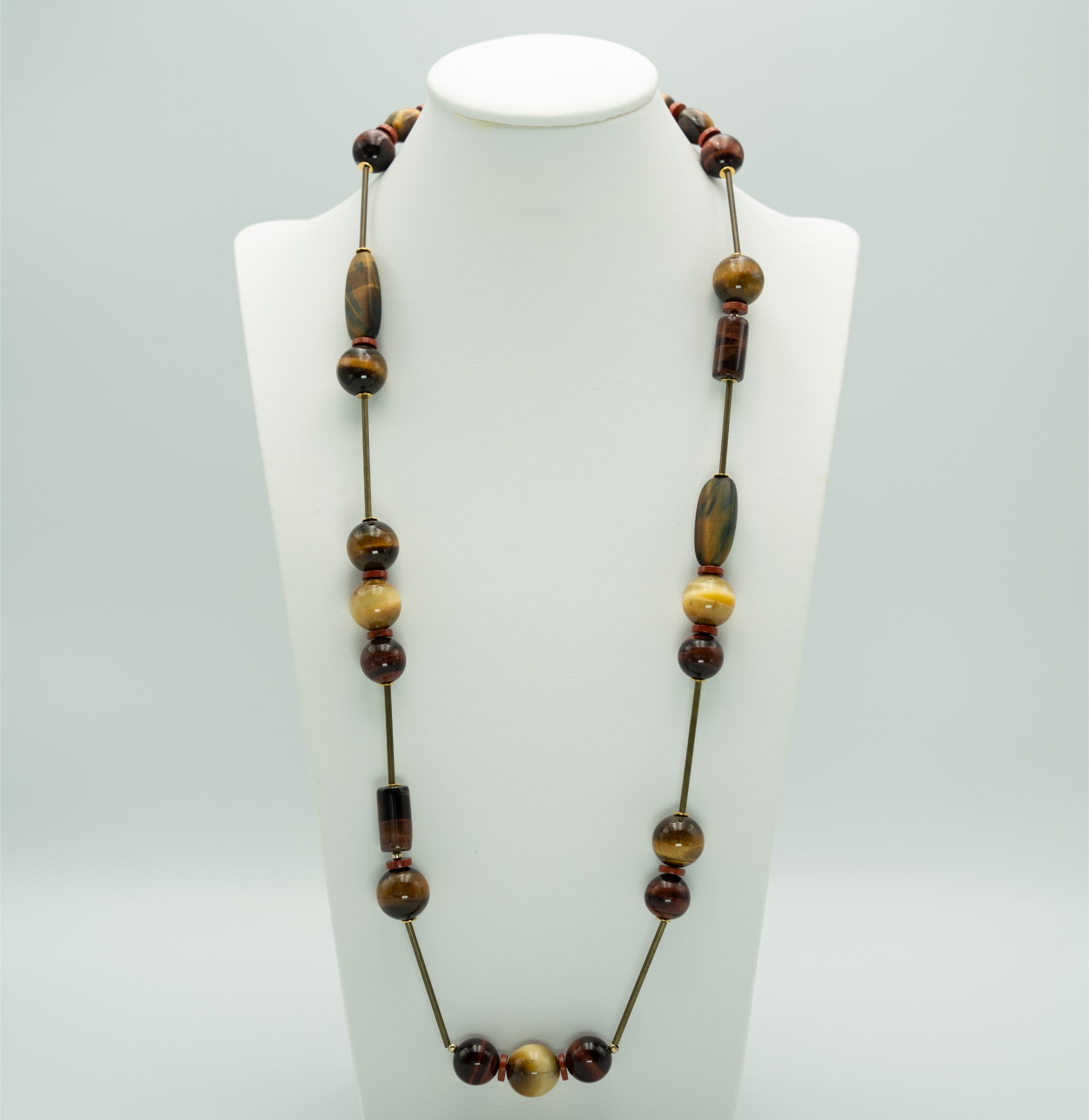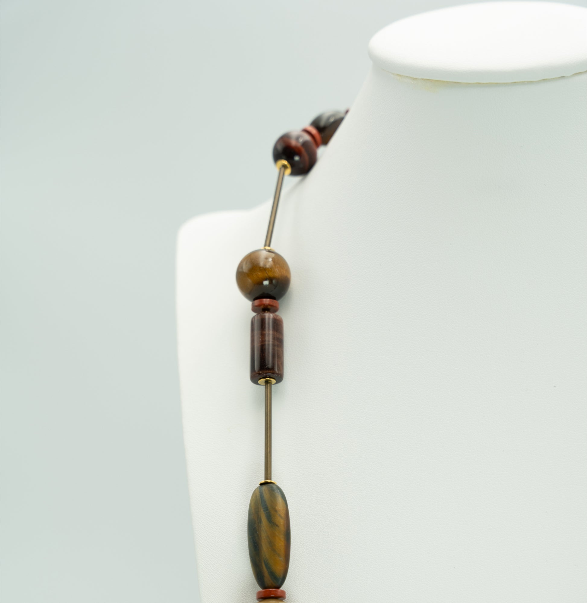 Three different (naturally occurring) colours of the semi-precious stone tiger’s eye (coffee-brown, reddish brown and golden-brown) come together in this 74 cm long asymmetric necklace. For more info on the necklace, please click on Details, and if interested in my musings, please go to Story.