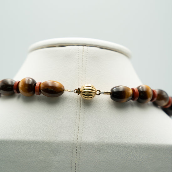 Golden, brown and red tiger’s eye beads in round, cylindrical, tabular and barrel shapes. Round beads from 10 to 16mm, tabular bead is 30mm long